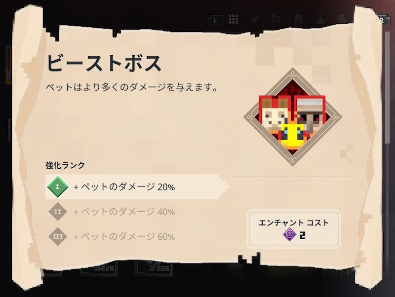 「ビーストボス」は、ペットが与えるダメージを強化するので、ペットを連れて行く場合は積極的にエンチャントをしましょう。