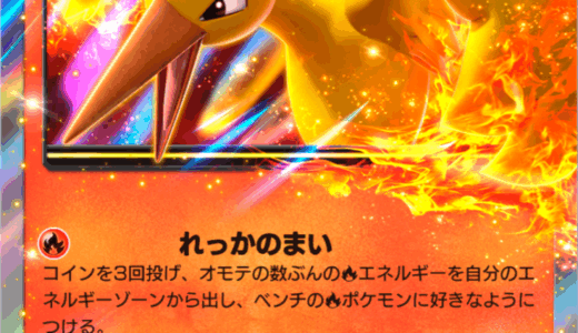 | カードの解説 | 羽ばたくと 翼の 炎が 赤く 美しく きらめく 伝説の 鳥ポケモンの 1匹。 |