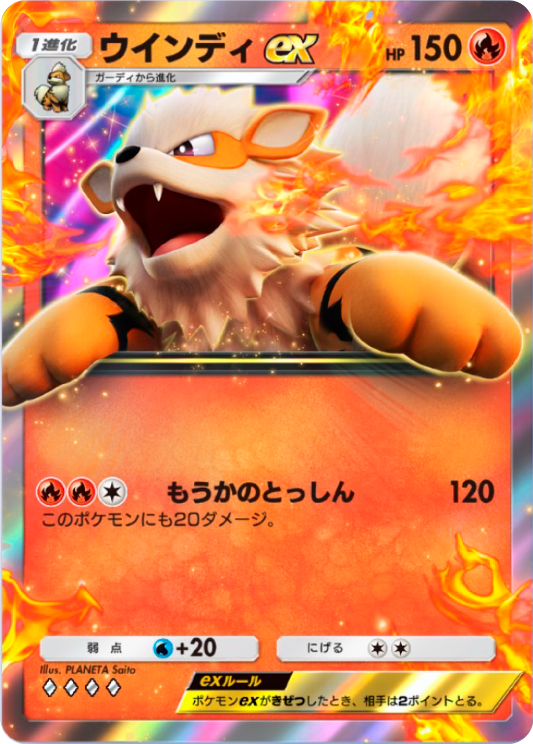 ウインディexは、3エネで120ダメージのもうかのとっしんが打てる、終盤まで活躍するポケモン。