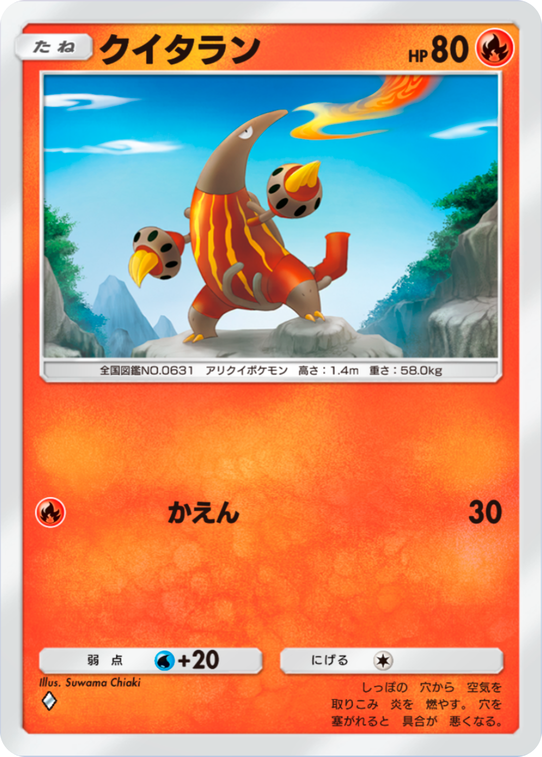 | カードの解説 | しっぽの 穴から 空気を 取りこみ 炎を 燃やす。穴を 塞がれると 具合が 悪くなる。 |