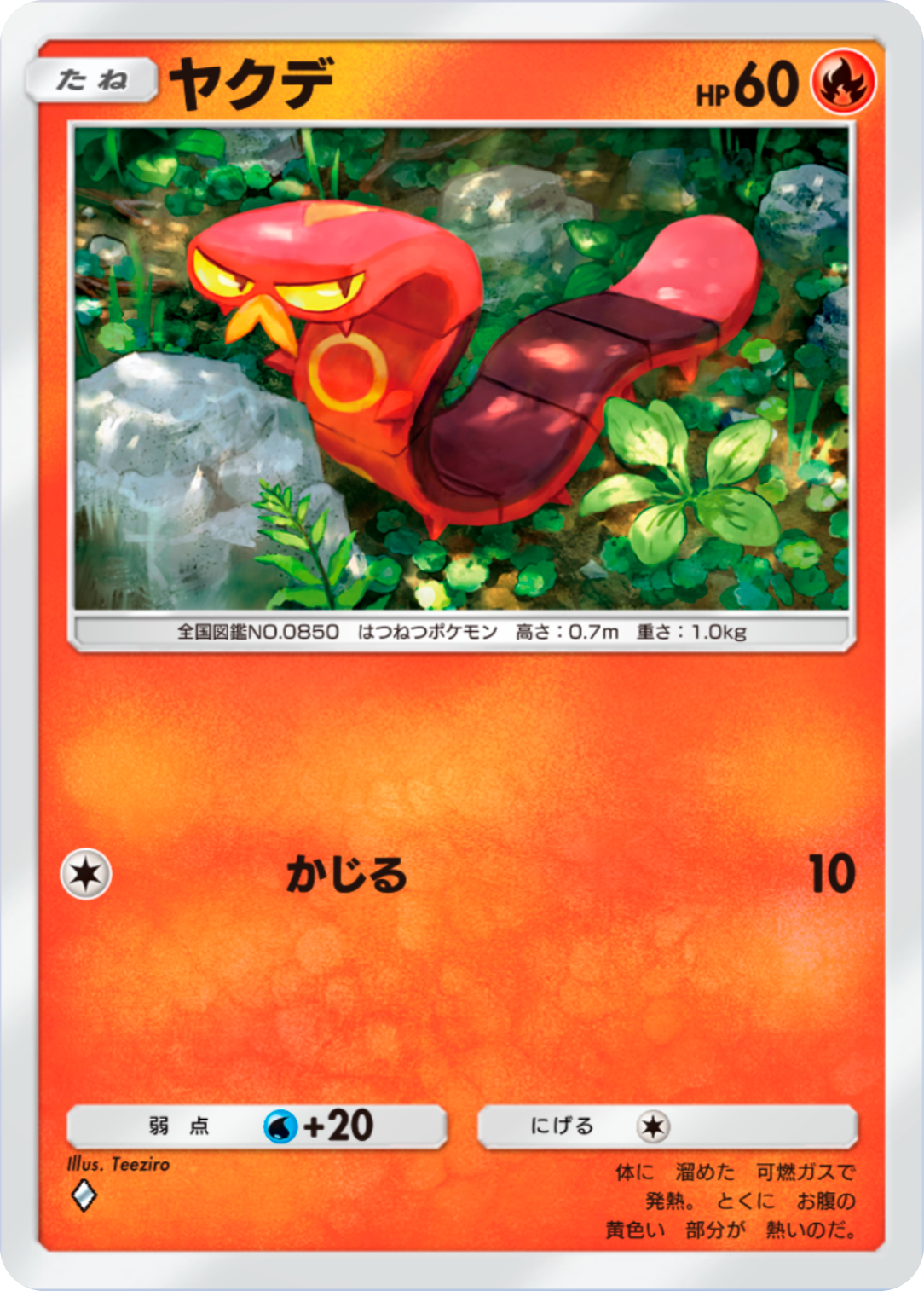 | カードの解説 | 体に 溜めた 可燃ガスで 発熱。特に お腹の 黄色い 部分が 熱いのだ。 |
